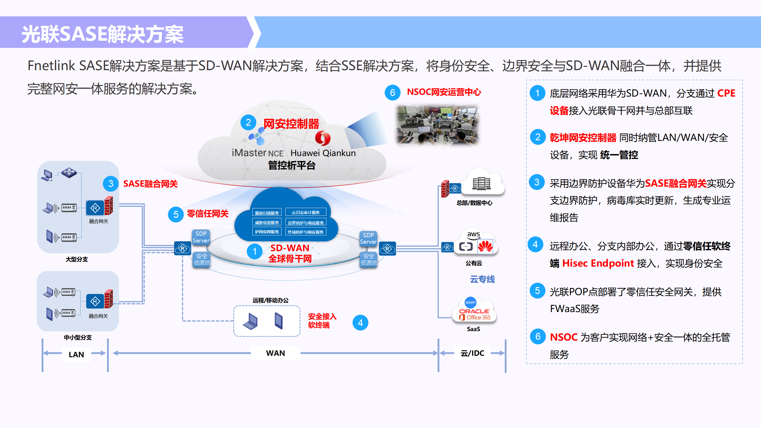 光聯與華為的深度合作從 SD-WAN 延伸至園區網路、邊界安全及零信任接入,實現了 以 iMaster NCE 控制器為核心的全網統一納管。基於光聯自建骨幹網,雙方共同打造多租 戶 SASE 服務架構,將 AP、交換機、防火牆、融合網關等設備與智能控制器無縫聯動,客 戶不僅能享受高性能的網路體驗,更能獲得敏捷部署與精細化安全管控。