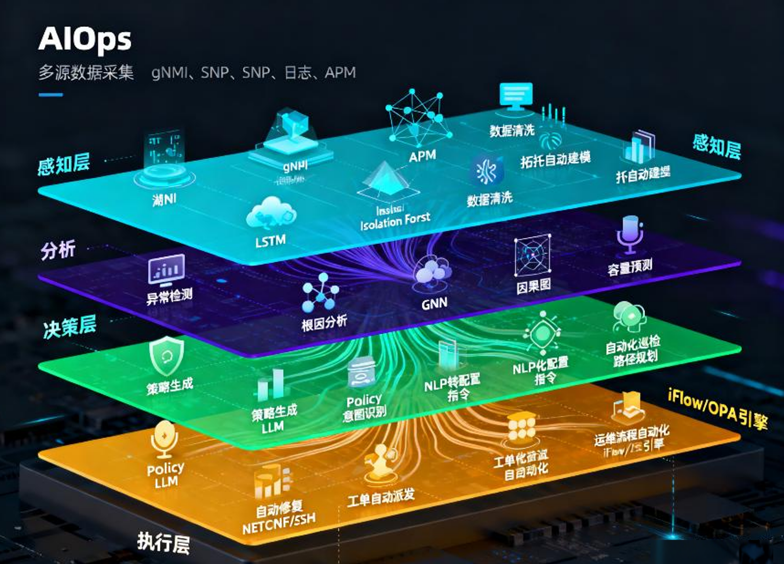 主要是结合故障预测、发现、通知、分析、处置、总结等主要运维场景,实现AI的智能化赋能。