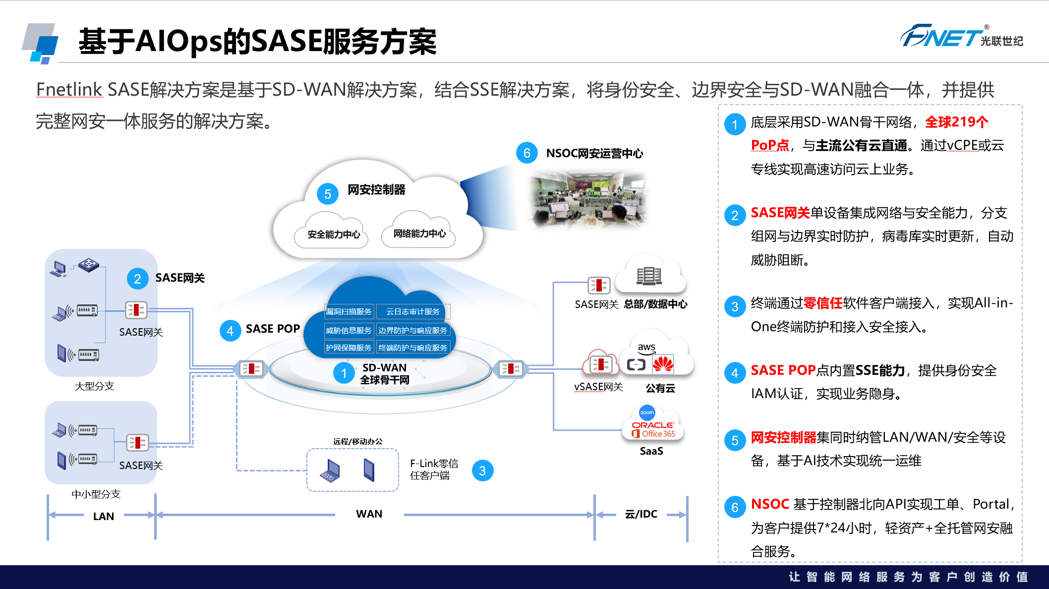 基于强大的控制器,光联打造的SASE解决方案通过六个部分实现通感一体化智能运维,分别是①覆盖全球的骨干网;②网安融合的分支CPE;③基于ZTNA的安全办公接入终端;④实现身份认证和应用隐身的安全网关;⑤统一纳管的控制器;⑥NSOC网安监控运营中心。整体方案在实现客户基础通讯需求及安全防护需求的同时,完成整网信息感知与采集, 通过Agent+MCP+工作流方式实现更高效的运维管理。